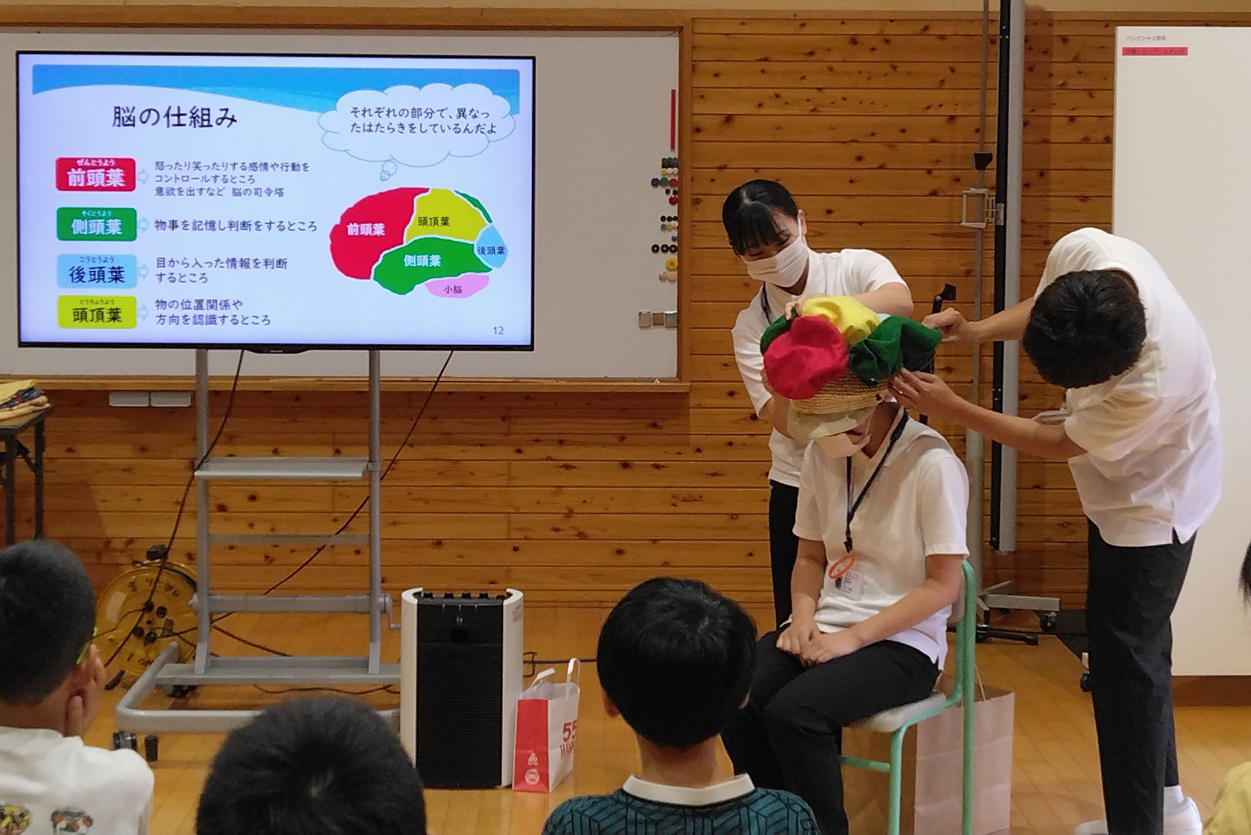 脳の仕組みについて、帽子を使って脳が縮む様子を解説する際には、看護実習に来ていた大学生にも手伝ってもらいましたが、「子供たちが主体的に学ぶ姿に共感した。」との感想をいただきました。